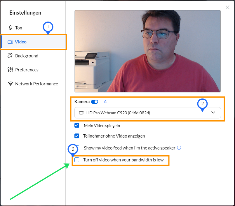 Wie im Printscreen unter Punkt (3) zu sehen, kann es manchmal auch zu Übertragungsprobleme der Webcam kommen. Wenn in den Einstellungen in einem laufenden Meeting das Ausschalten der Webcam bei schlechter Bandbreite ausgewählt ist, kann es zu automatischen Abschaltungen während eines Meetings der Webcam kommen.